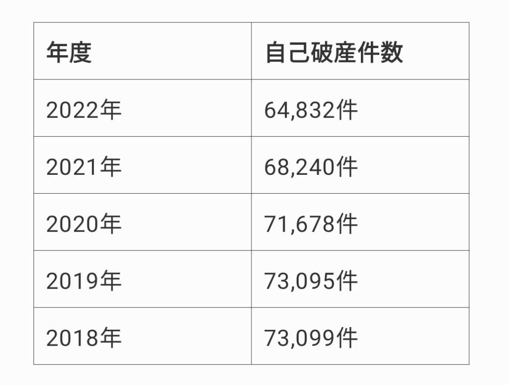 このデータから、自己破産の件数は2018年以降、減少傾向にあることがわかります。